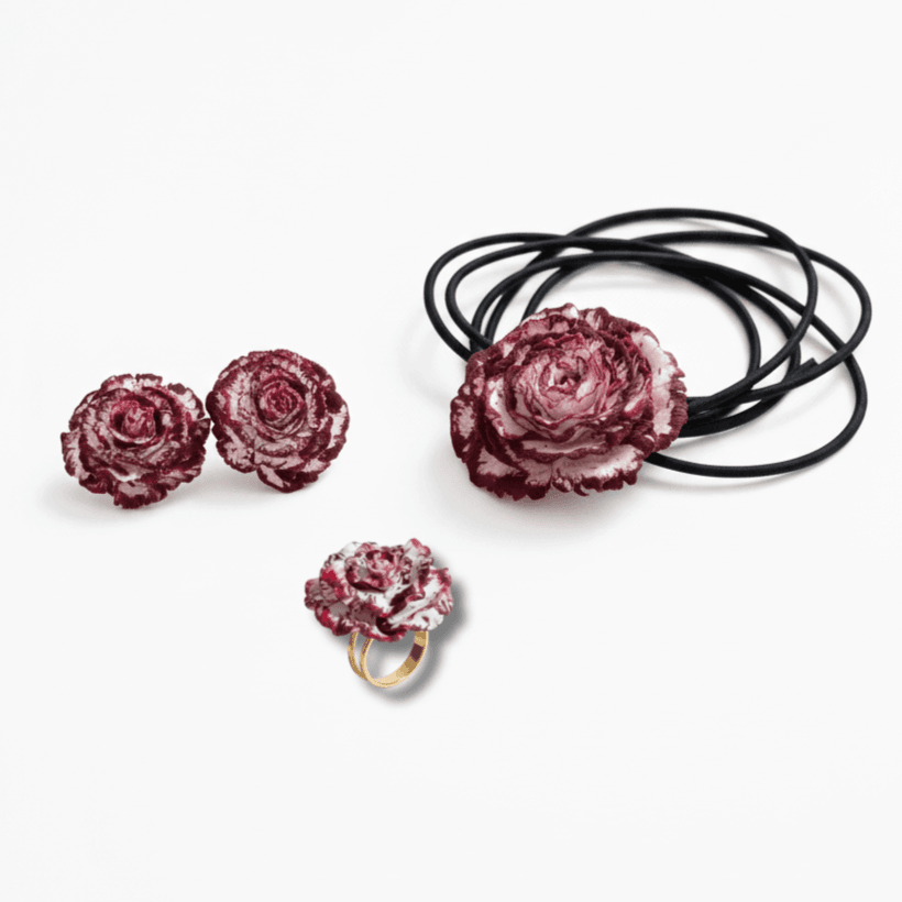Tamaño del clavel: pendientes 4 cm, anillo 3,5 cm, choker 7 cm.