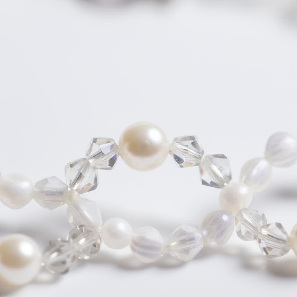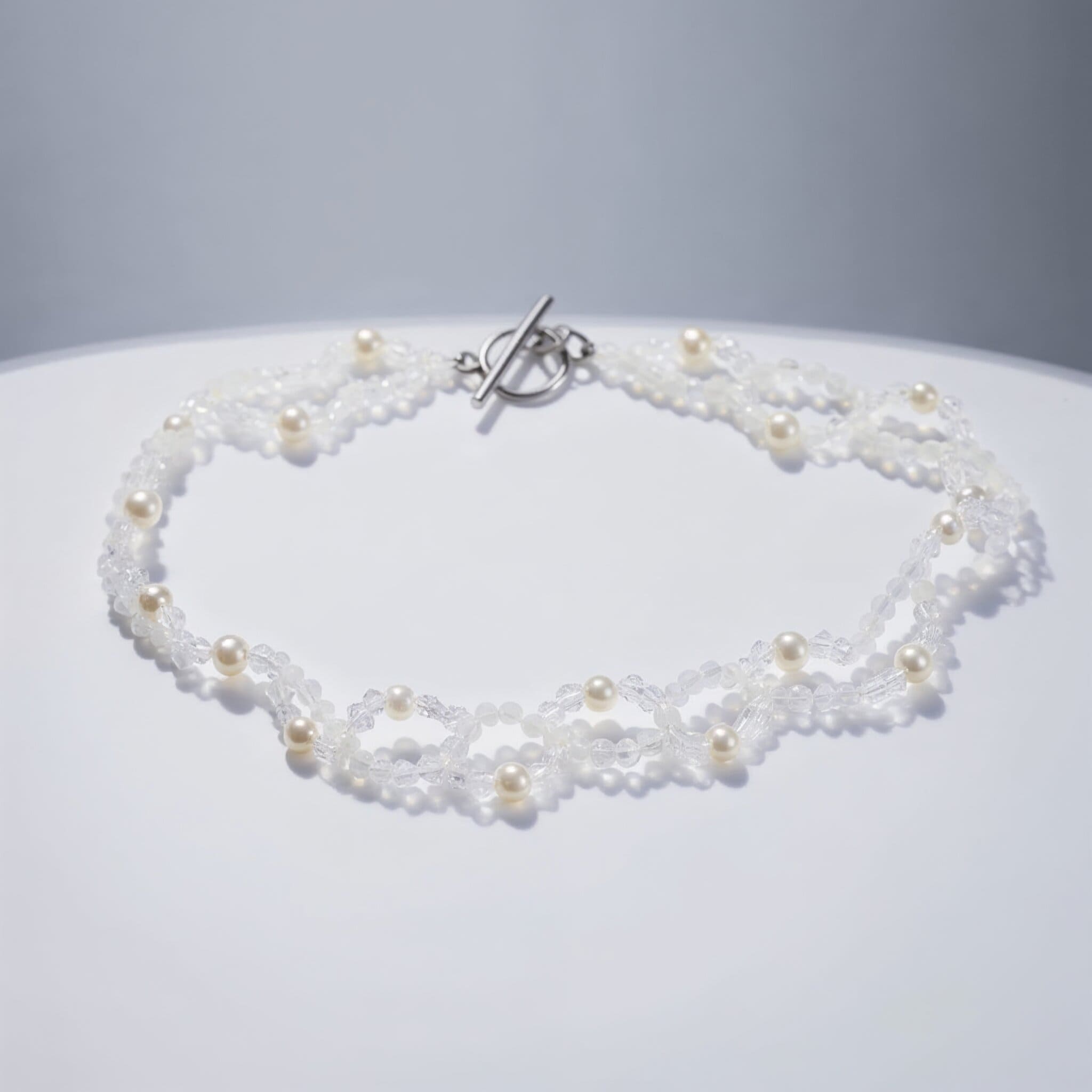 La gargantilla Nora trenza dos hileras de cristal y perlas que dibujan un motivo delicado y luminoso. Se adapta al cuello con comodidad, realza escotes cuadrados, halter o palabra de honor y aporta un toque clásico-actual que favorece tanto en foto como en directo. Diseñada y montada a mano en Málaga, pieza a pieza, para un acabado pulcro y duradero.