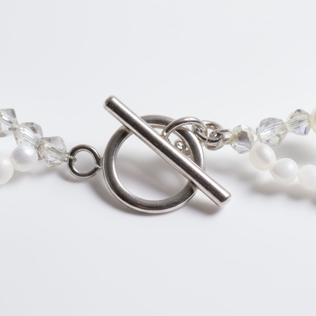 Materiales: cristal facetado transparente, piedras agatha y perlas nacaradas de vidrio.