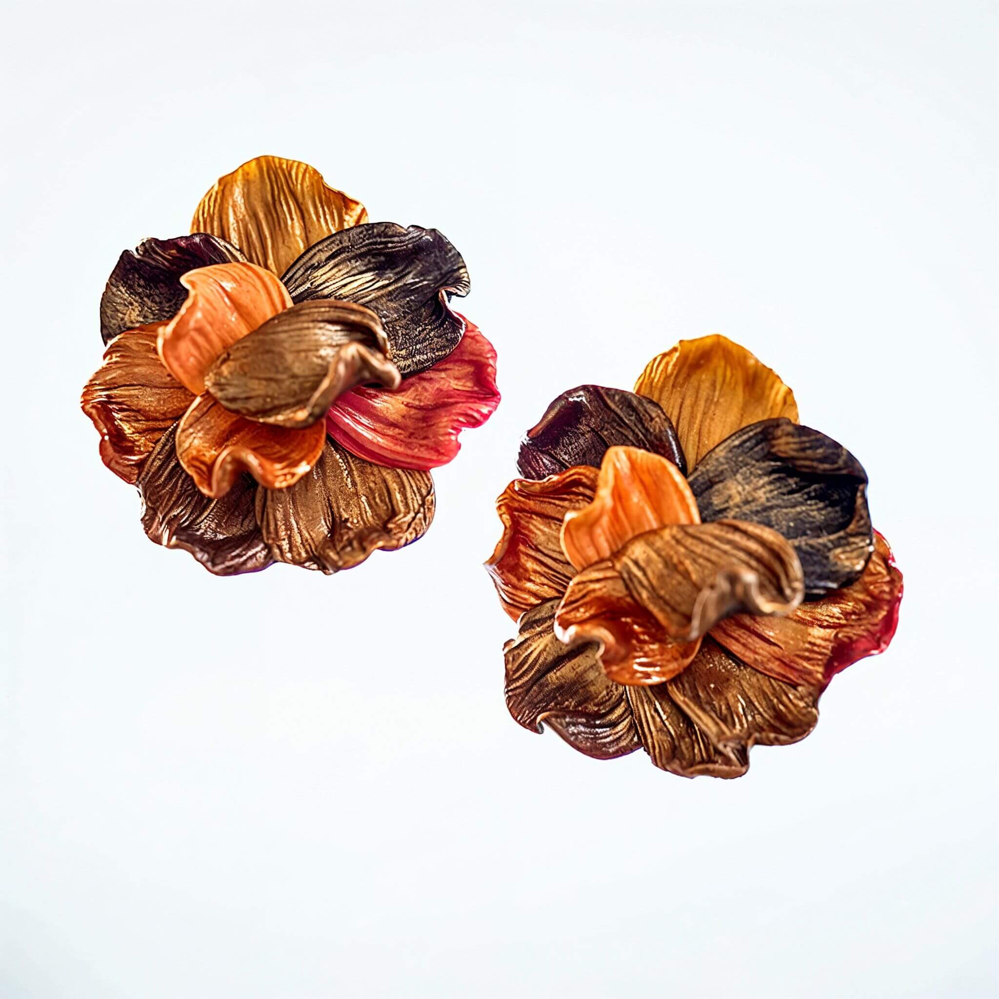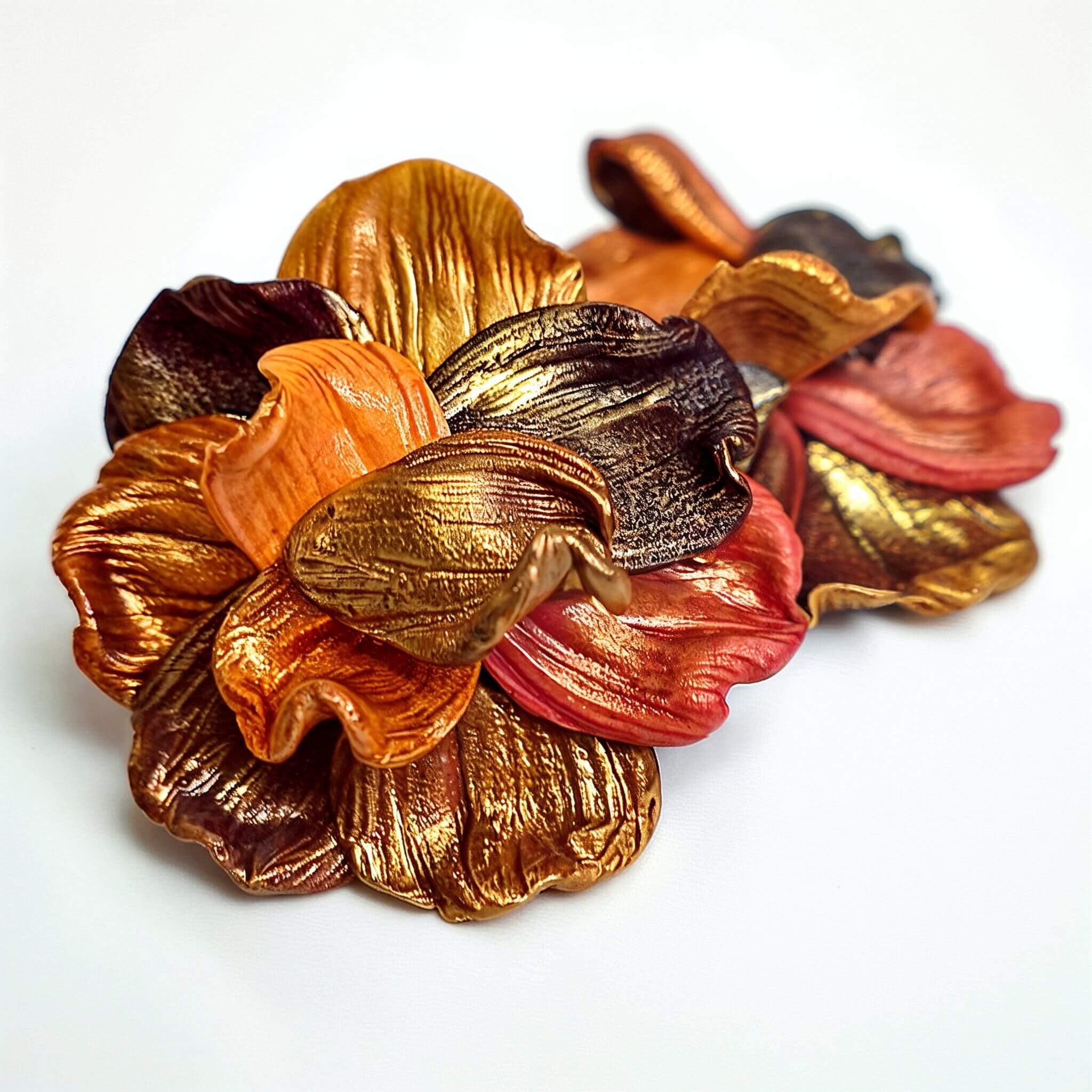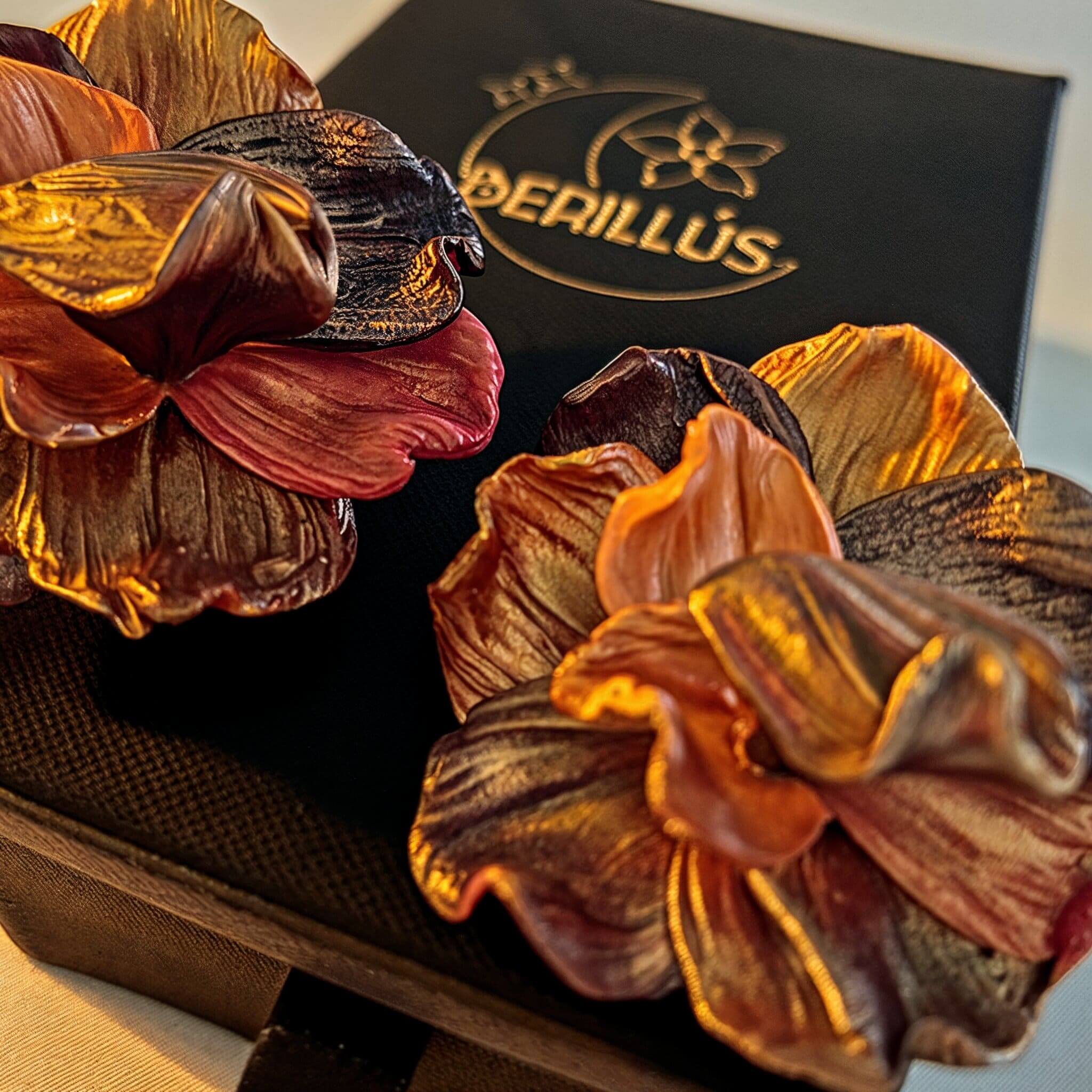 Dalia es una flor esculpida pétalo a pétalo en una paleta elegante —oro viejo, ámbar miel, cacao suave y un toque rosé— pensada para looks de boda y cenas de gala.
