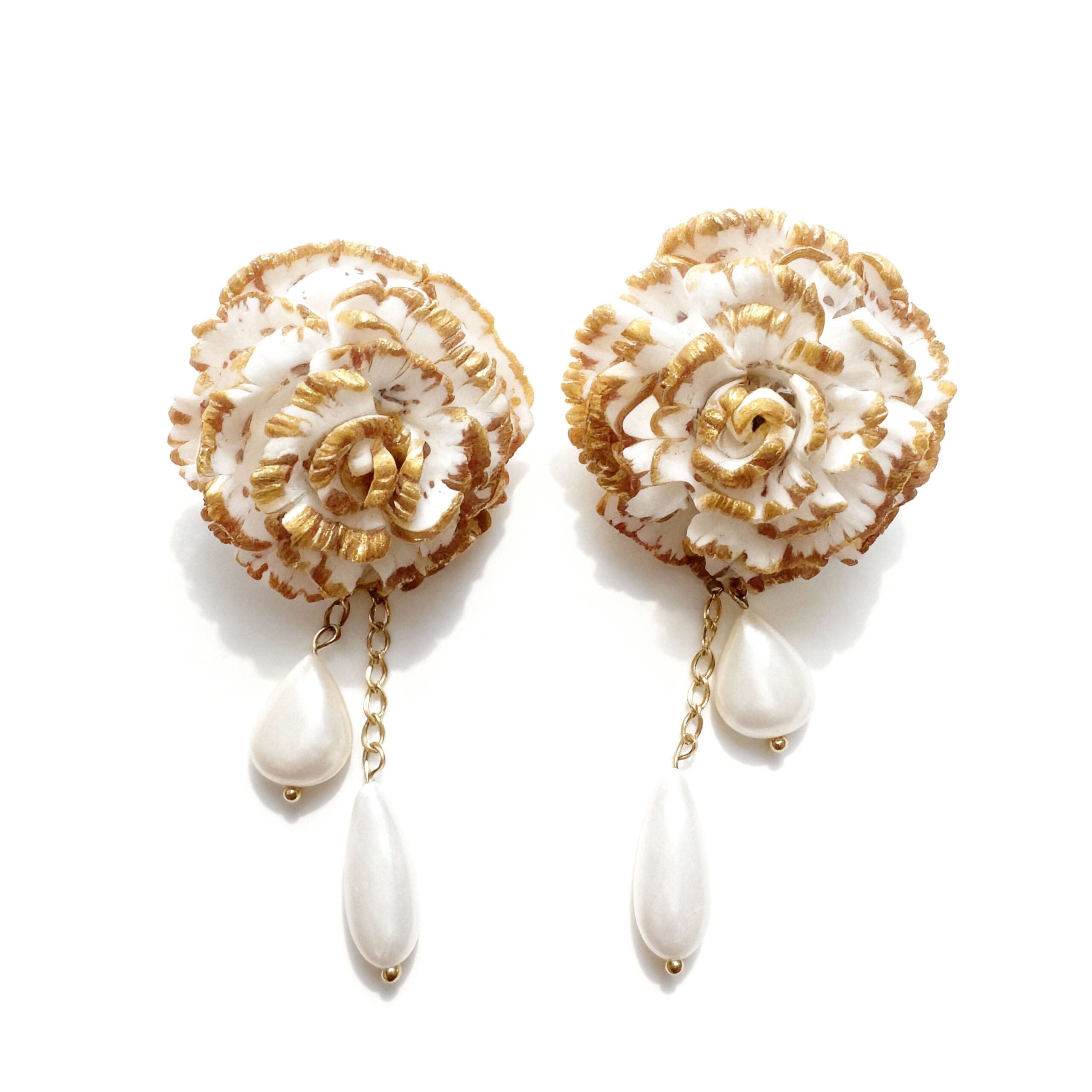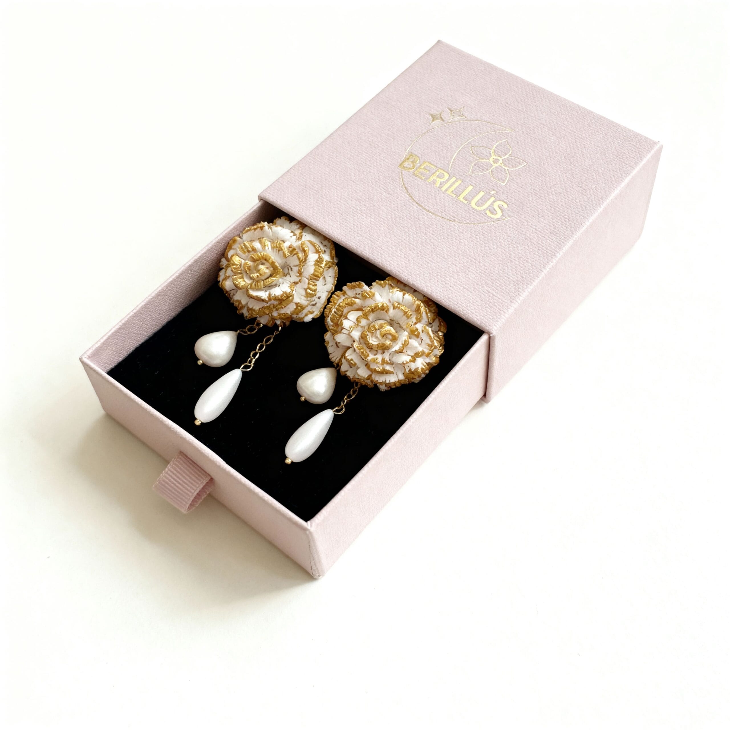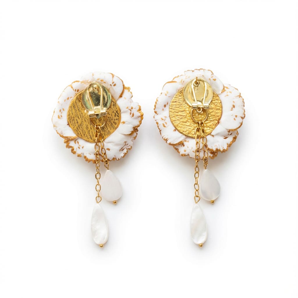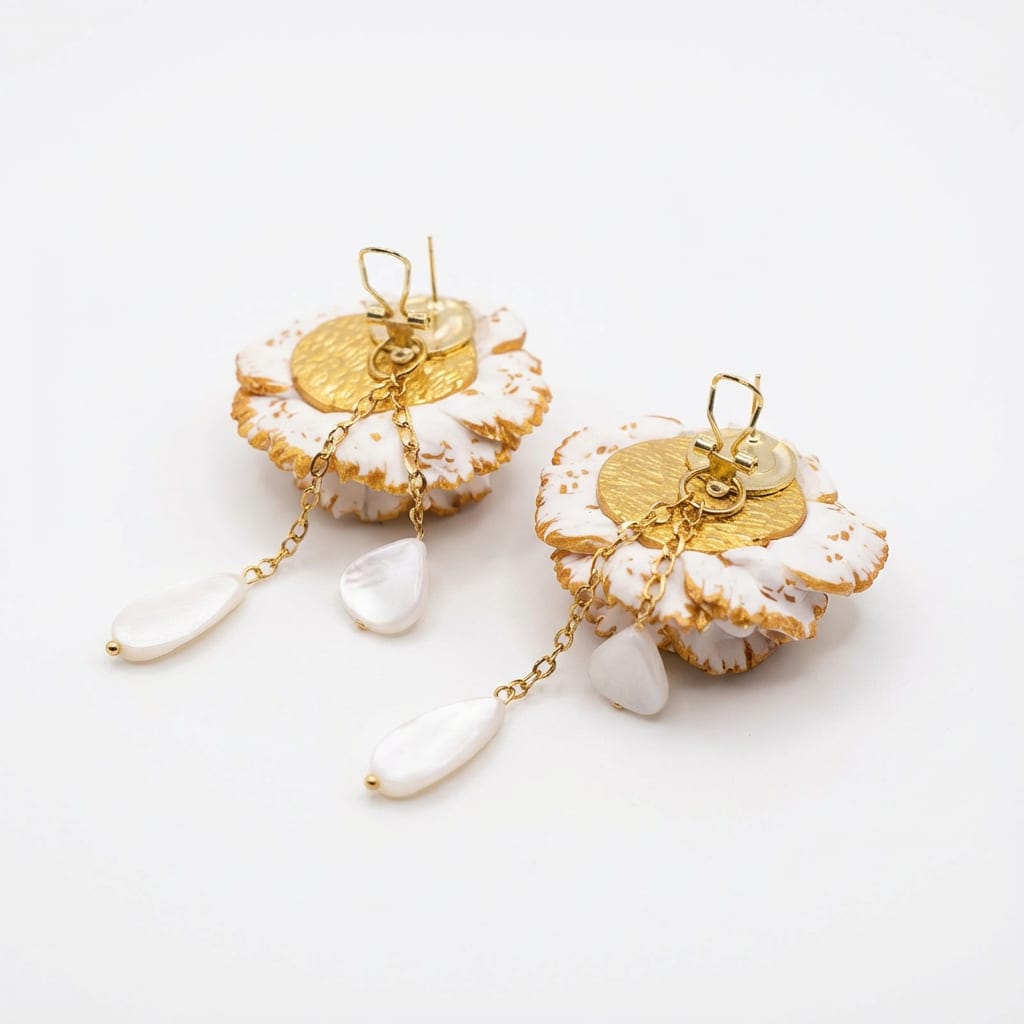 Material principal: arcilla polimérica (acabado blanco con filo dorado).
